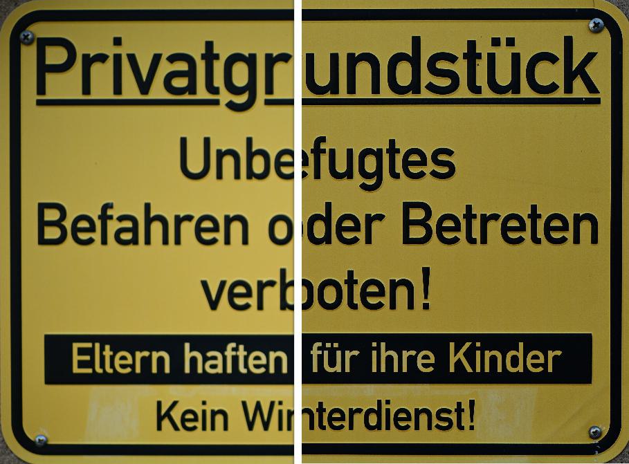 Hier mal der dirkete Vergleich mit dem 85er. Einmal mit Blende 2,0 und dann mit 5,6. Das Objektiv hat ja eine Floating Elements Konstruktion, da ist so eine Aufnahme im Nahbereich (hier ca. 1 m) kein Qualitätsproblem. Das Schild habe ich übrigens nur genommen, weil man da die Unterschiede sehr einfach erkennen kann.