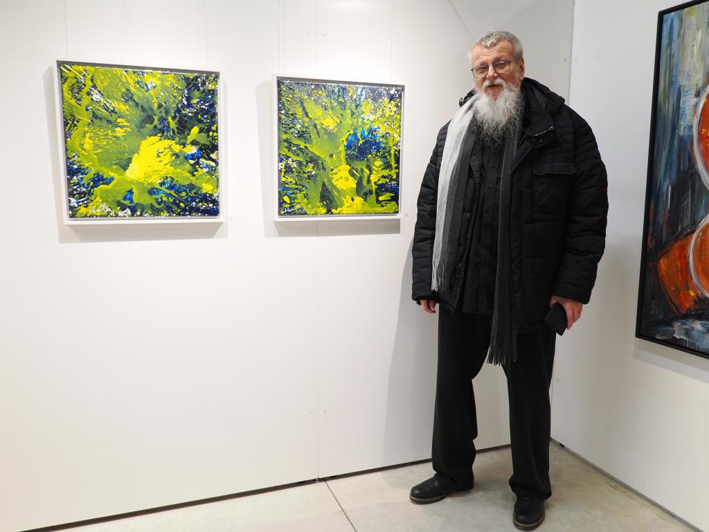 Ausstellung in Straubing. Werner Claßen mit seinen beiden Werken Farb-Impuls 37 und 38. „Wir leben in unruhigen Zeiten 1 und 2“.