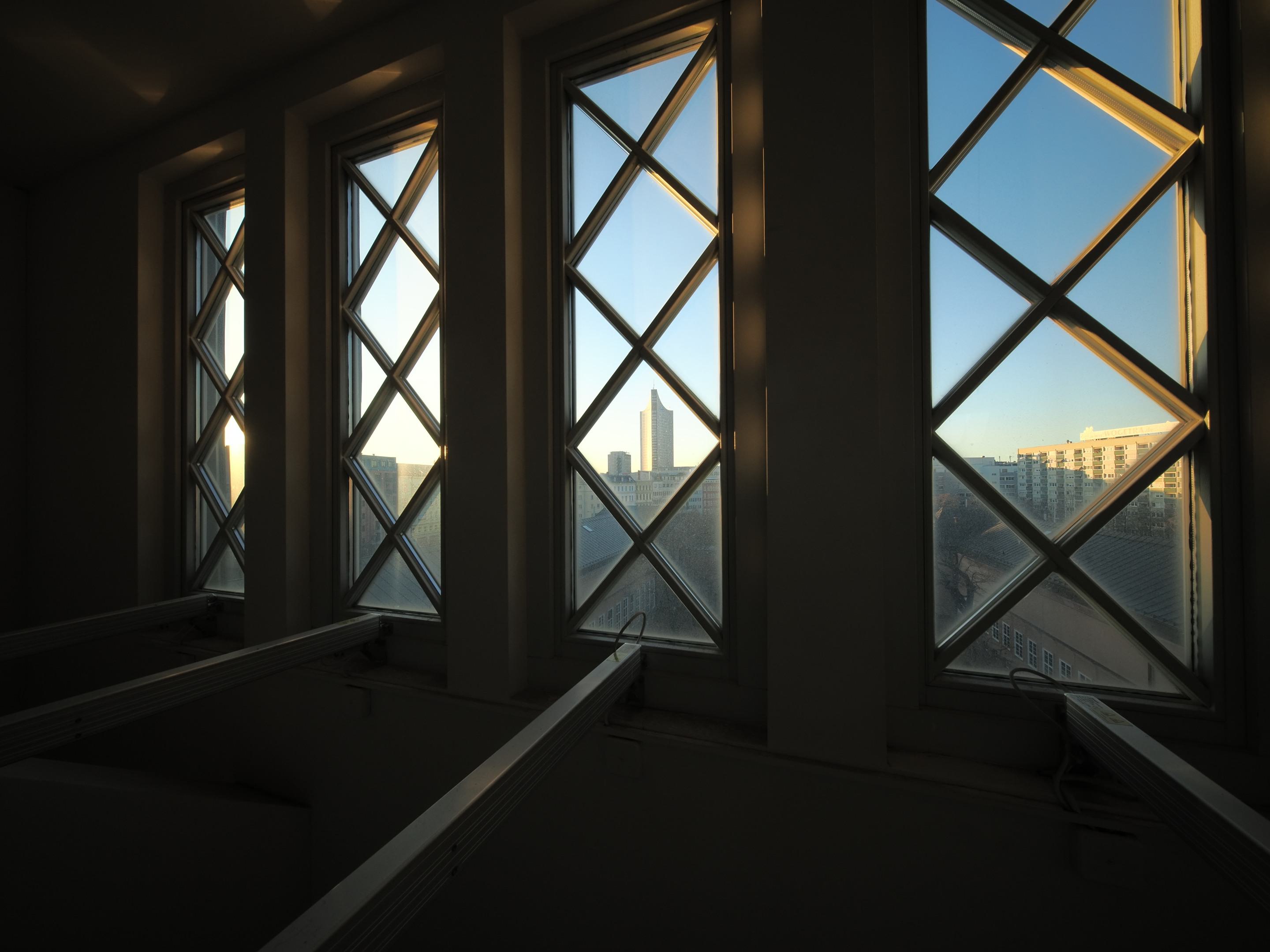 Im Grassi in Leipzig gibt es eine hölzerne Empore. Wer da raufsteigt, kann auf ein Stück Leipzig rauskucken. Wenn man das mit einem 6mm Laowa macht, kann das dann so aussehen…