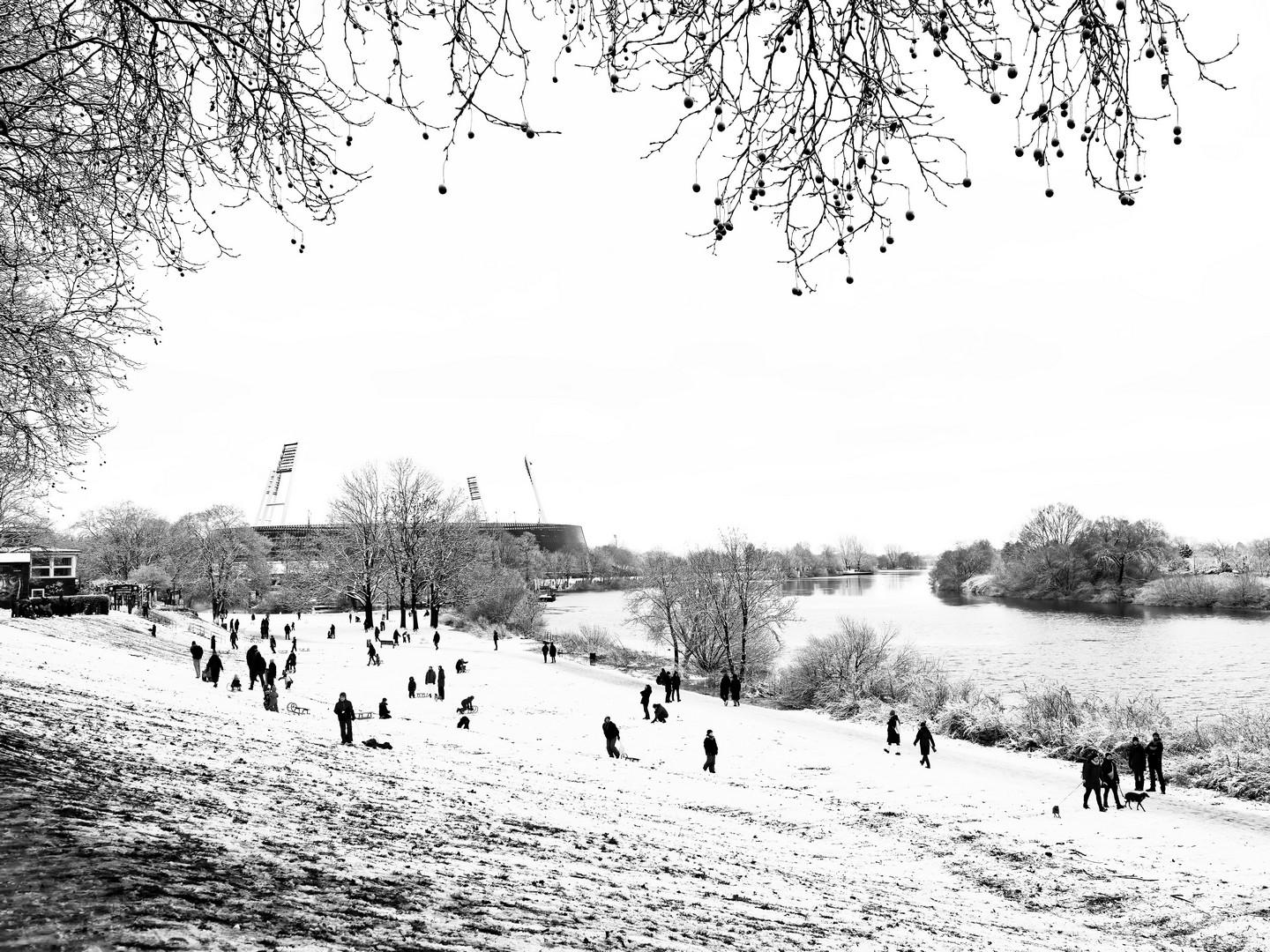 Ausflug am Weserdeich. Wenn tatsächlich mal wieder Schnee gibt, dann wird er genutzt .. und Klein und Groß sind unterwegs