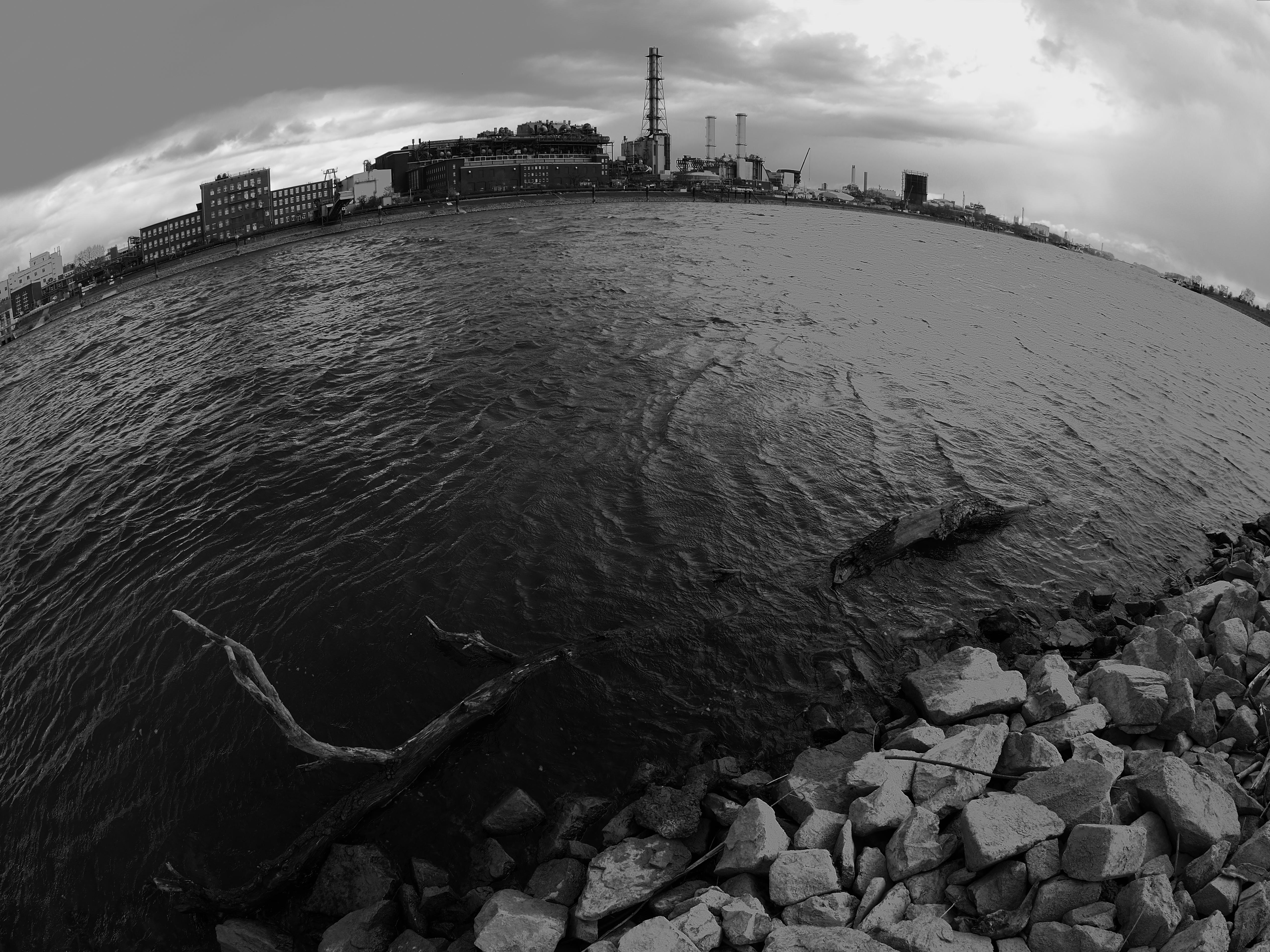 Drei Bildelemente. Ufer, Ast und Fabrik. Der tote Ast hat natürlich ne Aussage und scheint in die Bildaussage zu passen, aber ich halte ihn für störend. Er bräuchte blaues Wasser für den Kontrapunkt. Diese schwarze, ölige Flüssigkeit steht alleine, die braucht den Ast nicht als Verstärkung. Außerdem führt der Ast Linien ein, die ins Nirgendwo führen, aber den Blick beeinflussen.
