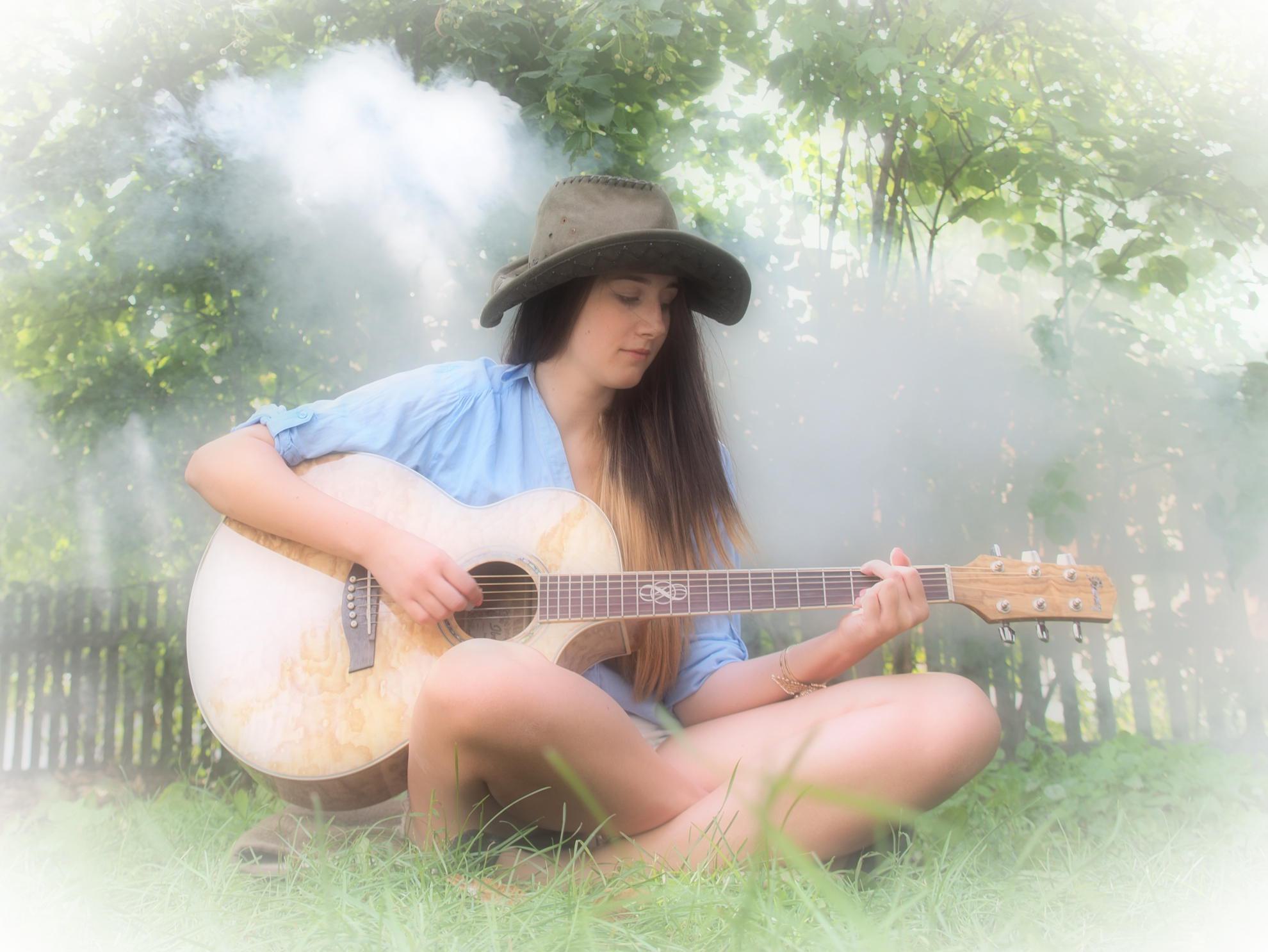 Frau mit Saiteninstrument in Rocksdorf mit Vignette und Weichzeichner. Selber fotofiert mit EP5.