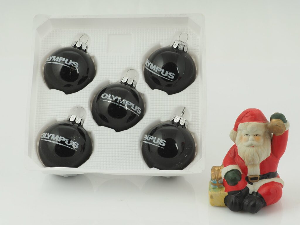 Was ganz abgefahrenes: Schwarze Christbaumkugeln mit Olympus-Schriftzug. Ein MUSS an jedem Christbaum eines echten Fans. Achtung! Die Kugeln sind kein Plastik, sondern Glas. In Plastik gab es sie mal in weiß – die sahen ziemlich seltsam aus – und werden jetzt auch schon für zehn Euro drei Stück vertickt. Die hier schauen Cool aus – und sind aus Glas.