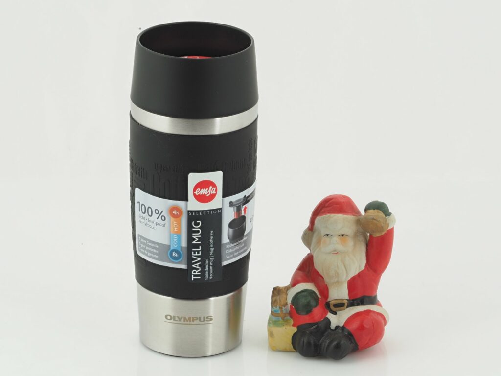 Noch ein Olympus Emsa Travel Mug. 100% dicht. Die Thermobecher sind prima, wenn man des Nächtens draußen Sterne fotografieren will. Die halten wirklich warm. Oder – im Sommer – auch kalt. Natürlich unused. Die Becher sind spülmaschinenfest und funktionieren tatsächlich. Ich habe seinerzeit für meine normale Emsa Travel Mug – ohne Olympus-Aufdruck – 25 Euro gezahlt. Derzeit kriegt man sie im Internet knapp unter 20 Euronen. Allerdings nicht mit Olympus-Aufdruck.
