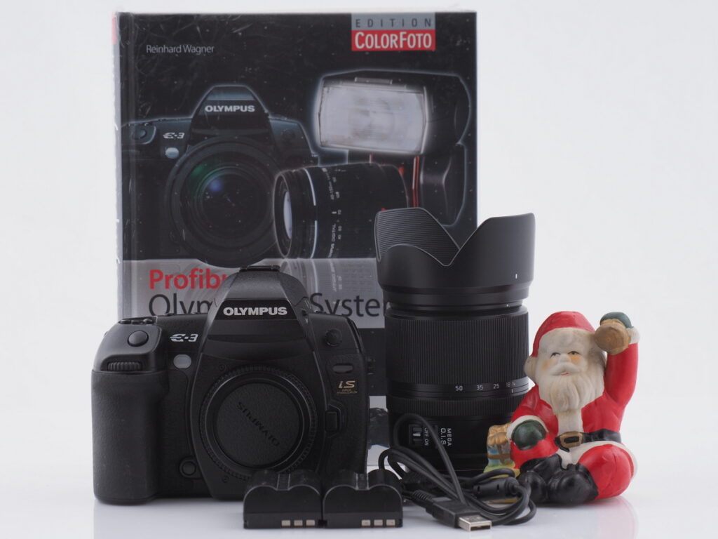 Ein komplettes Package. Eine E-3, zwei Originalakkus, Ladegerät, USB-Kabel, ein ziemlich neu aussehender Originalgurt, ein E-System-Buch (mein letztes eingeschweißtes Autorenexemplar, gebraucht werden die Bücher schon um die 70 Euro gehandelt.), ein Panaleica 12-50 ohne sichtbare Gebrauchsspuren. Gesamtwert auf dem Gebrauchtmarkt derzeit um die 500 Euro. Die E-3 hat Rudolf zur Verfügung gestellt.