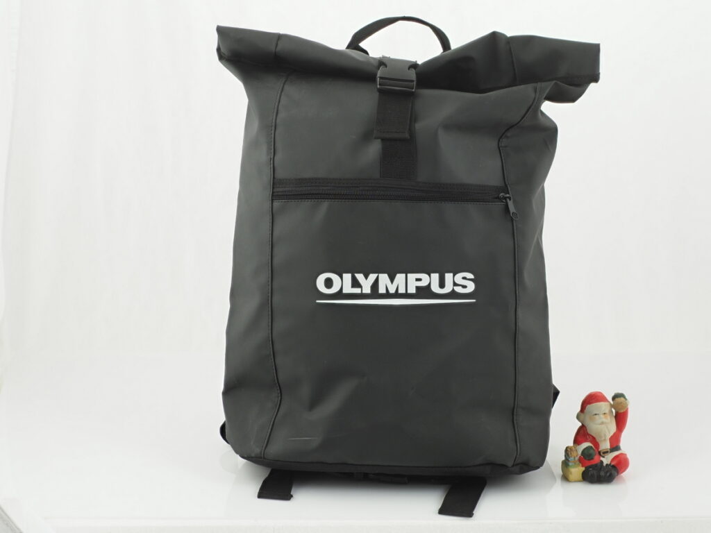 Heute gibt’s einen wasserdichten Rucksack. Das ist kein Kamerarucksack, sondern wie ein Ortlieb einfach ein regensicherer Sack, nur eben mit Trageriemen und Rückenpolster. Man kann ihn oben aufmachen – da sind zusätzlich Klettverschlüsse – oder eben auch am Rücken. Da gibt’s einen Reißverschluss. Übrigens auch vorne, da gibt’s eine ziemlich große, flache Tasche. Deshalb ist das also kein echter, wasserdichter Rucksack, die Ortliebs kann man ja als Schwimmhilfe nehmen, aber der Rucksack dürfte so ziemlich jeden Regenguss aushalten, den der Fotograf aushält.