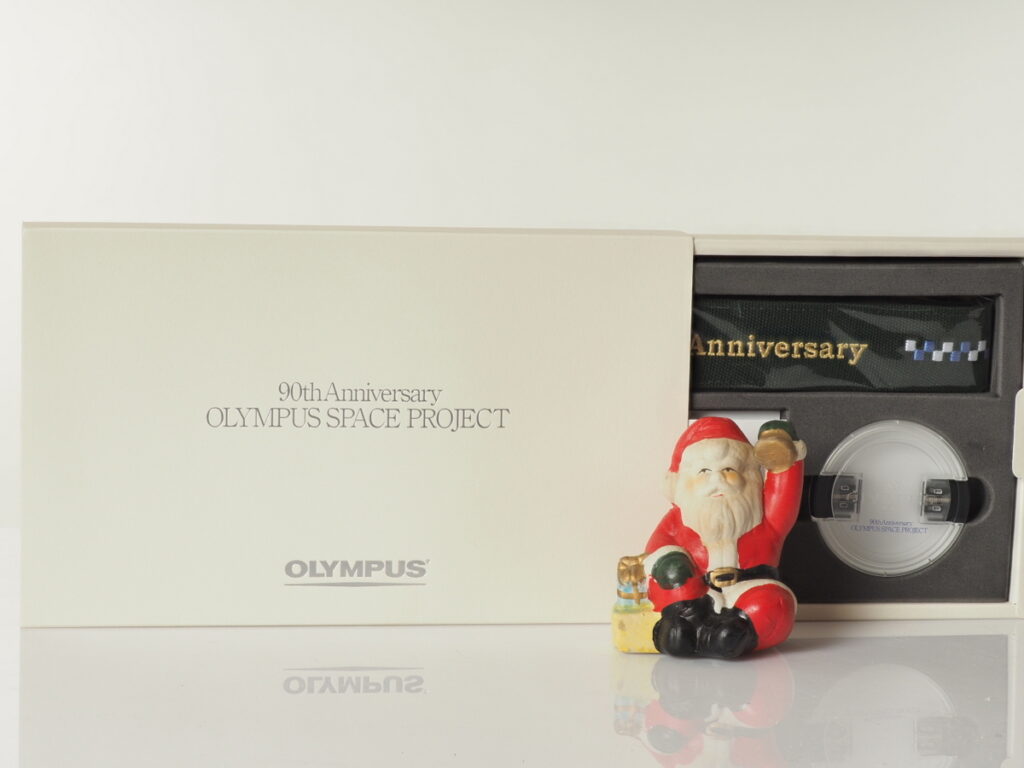 Zum 90. Geburtstag von Olympus vor zehn Jahren wurde eine E-3 mit 12-60 und 50-200 SWD ins All geschickt. Damit man sehen konnte, ob eventuell die Linsen unter den Deckeln gebrochen waren, mussten die Deckel durchsichtig sein – denn wenn die Linsen gesplittert sind, kann das in der Schwerelosigkeit verheerend sein. Also wurde ein Set aus zwei Objektivdeckeln und einem grünen Geburtstagsgurt in Auflage 10.000 aufgelegt. Das wurde nie verkauft, sondern nur als Werbegeschenk übergeben. Dieses SpaceKit hier ist brandneu, nicht ausgepackt und nur für das Foto aufgeschoben.