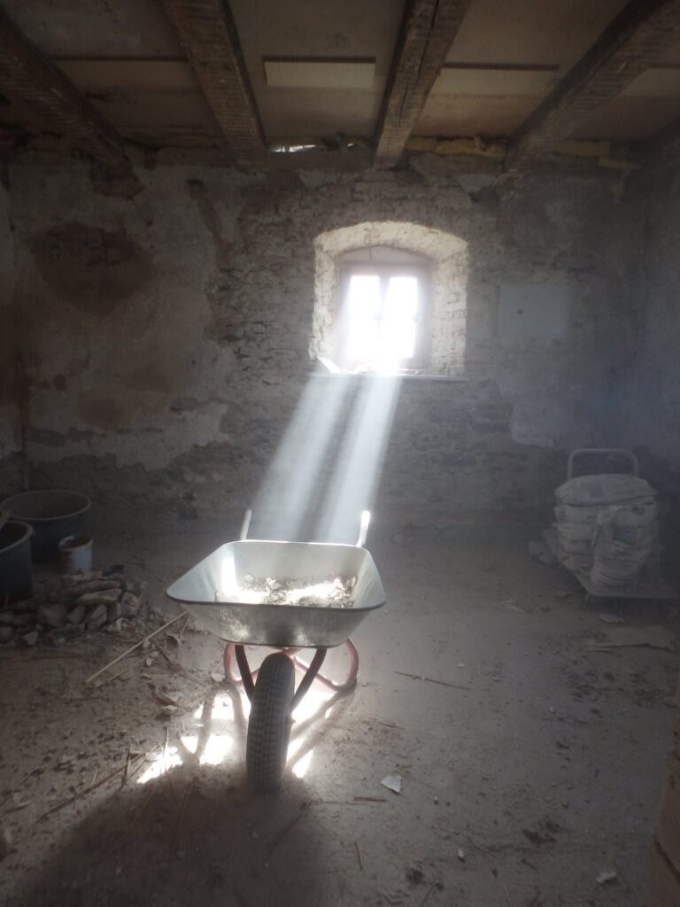 „Finger of God“ wird der Effekt genannt, wenn die Sonne durch Wolkenlöcher auf feinen Dunst trifft und spektakuläre Strahlen produziert. Idealerweise natürlich vor dunklen Wolken, dann wird das spektakulärer. Natürlich habe ich solche Fotos auch – wer hat die nicht. Aber zur Abwechslung zeige ich mal andere. Das hier zum Beispiel mit der Schubkarre. Morgensonne scheint durch’s Fenster und ich habe extra noch ein bisschen Stab produziert, damit man die Strahlen schön leuchten sieht.