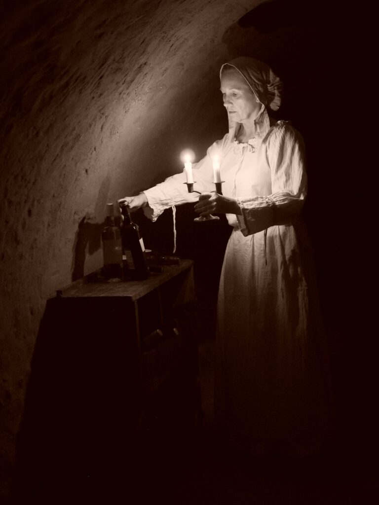 Was man bei dem Bild sehr gut sieht, ist die Helligkeitsverteilung von Punktlichtquellen. Am Rock sieht man, wie schnell das Licht im nichts versackt – es wird eben mit dem Quadrat der Entfernung weniger. Verlängert man die Belichtung um den Rock zu beleuchten, brennt das Oberteil aus. Auch nicht gut. Eine andere Möglichkeit sind weitere Kerzen, die außerhalb des Bildes stehen und damit aufhellen: