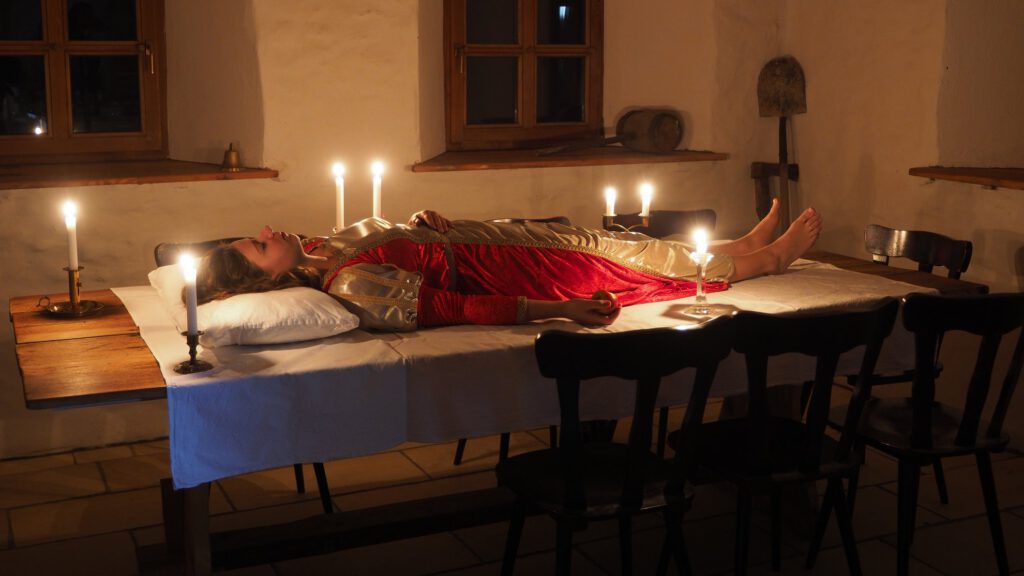Beim Fotografieren von Personen mit Kerzen muss man „bescheissen“. Im „wahren Leben“ sorgt man natürlich dafür, dass die Kerzen am Tisch stehen, oder, wenn man es ganz luxuriös haben will, von der Decke hängen. Aber es sind halt nun mal Punktlichtquellen und wenn eine Kerze am Tisch steht beleuchtet sie erst mal den Tisch – und dann erst das Gesicht. Der Tisch wird also hell, das Gesicht nicht. Und dann kommt das Licht auch noch von unten – Grusellicht. Man muss also dafür sorgen, dass die Kerzenflamme etwa in Nasenhöhe leuchtet. Das ist, wenn man als Model was sehen will, doof, weil das Licht blendet. Aber als Fotografen wollen wir halt Licht im Gesicht haben – und nicht auf dem Weg, den das Model vielleicht gehen will. Aus diesem Grund sind diese Bilder meistens „falsch“ – geht aber nicht anders.